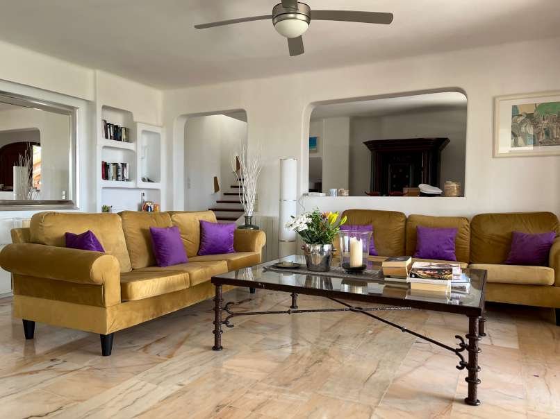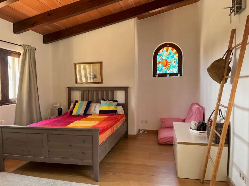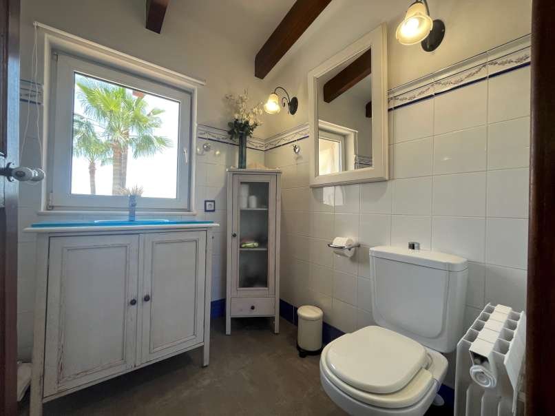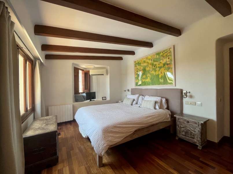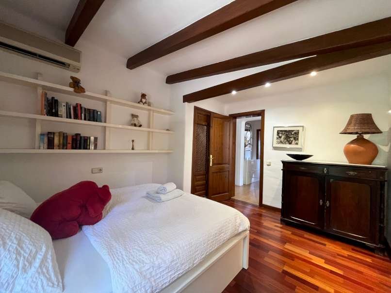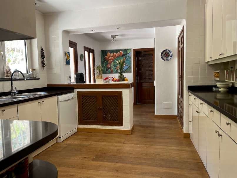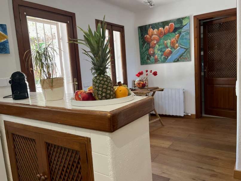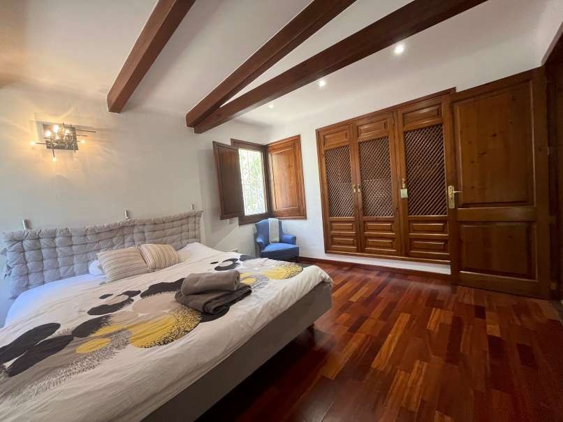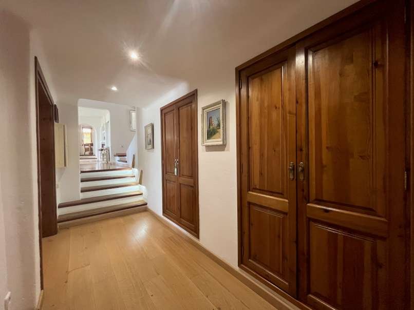 En el interior, la espaciosa y luminosa zona de estar destaca por sus vigas de madera parcialmente vistas, el elegante suelo de mármol y una acogedora chimenea, perfecta para crear momentos únicos en cualquier época del año. La villa dispone de cinco dormitorios con suelo de parquet y tres baños, ofreciendo amplitud y comodidad para toda la familia y sus invitados.