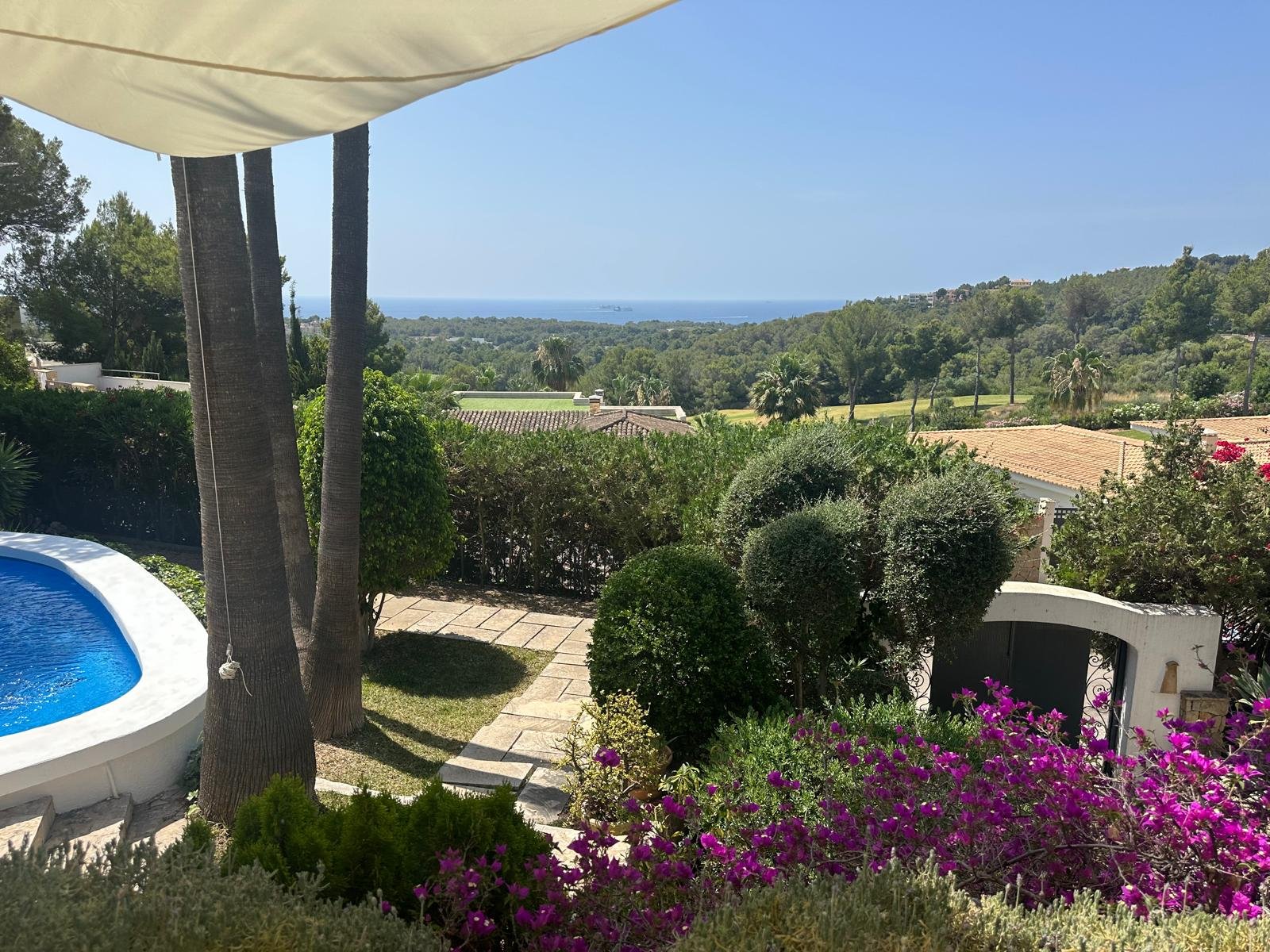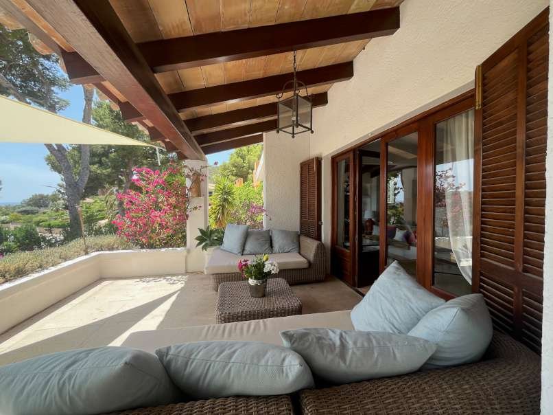 Las amplias terrazas, con una superficie total cercana a los 170 m², invitan a disfrutar del sol durante todo el día y de agradables vistas al campo de golf. El cuidado jardín paisajístico, rodeado de vegetación mediterránea, y la atractiva zona de piscina conforman un oasis privado ideal para el descanso y el entretenimiento al aire libre.